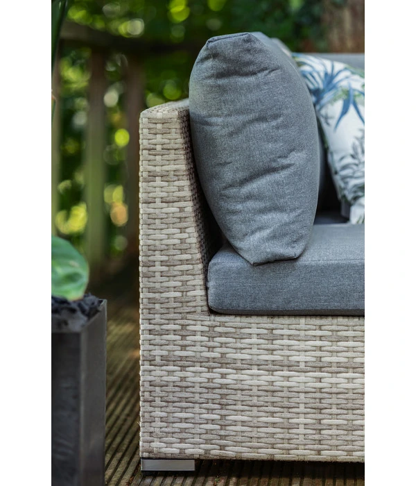 Die gleichmäßige Flechtstruktur und die lebendigen Farbnuancen des Geflechts verleihen dem Dehner Balkonset Como seine besondere Ausstrahlung, die an Rattanmöbel erinnert. Und damit liegen Sie schon fast richtig. Auch hier wurde jedes Möbelstück von Hand geflochten, nur dass es sich nicht um Natur-, sondern um Polyrattan handelt. Das heißt, Sie erhalten Outdoormöbel mit dem individuellen Charakter von Handarbeit, die jedoch zusätzlich unglaublich robust, pflegeleicht und wetterunempfindlich sind. Dass im Inneren ein Alugestell für Stabilität sorgt und obenauf hochwertige Polster mit abnehmbaren, waschbaren Kissenbezügen Komfort bieten, macht die Sache rundum perfekt.